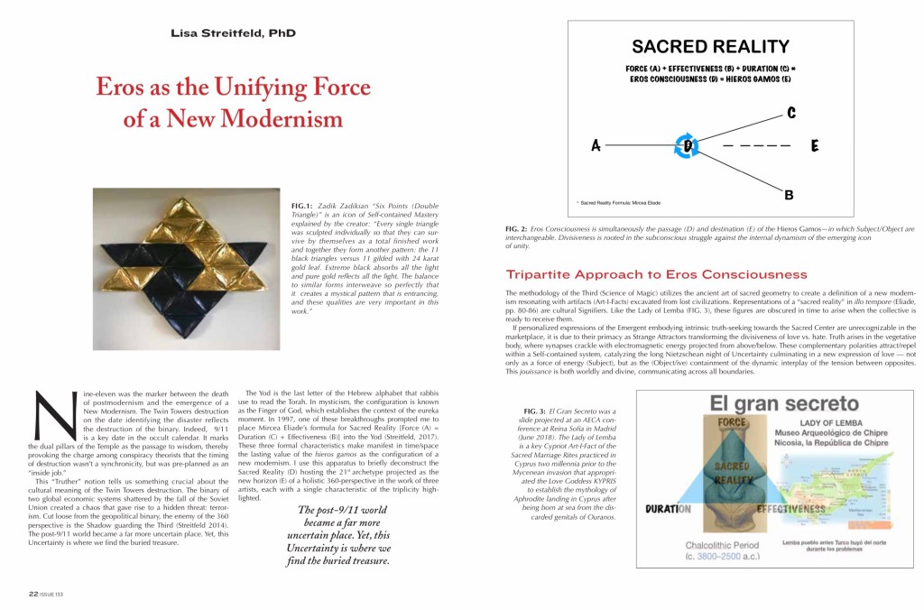 L.P. Streitfeld’s theory of the HIEROS GAMOS icon as the origin of a 21st century modernism was introduced to the International Association of Art Critics (AiCA) at the 2018 Congress by the Spanish chapter (AECA) in Madrid. The presentation included iconic inter-gender images prescient of the 2020s transgender movement.