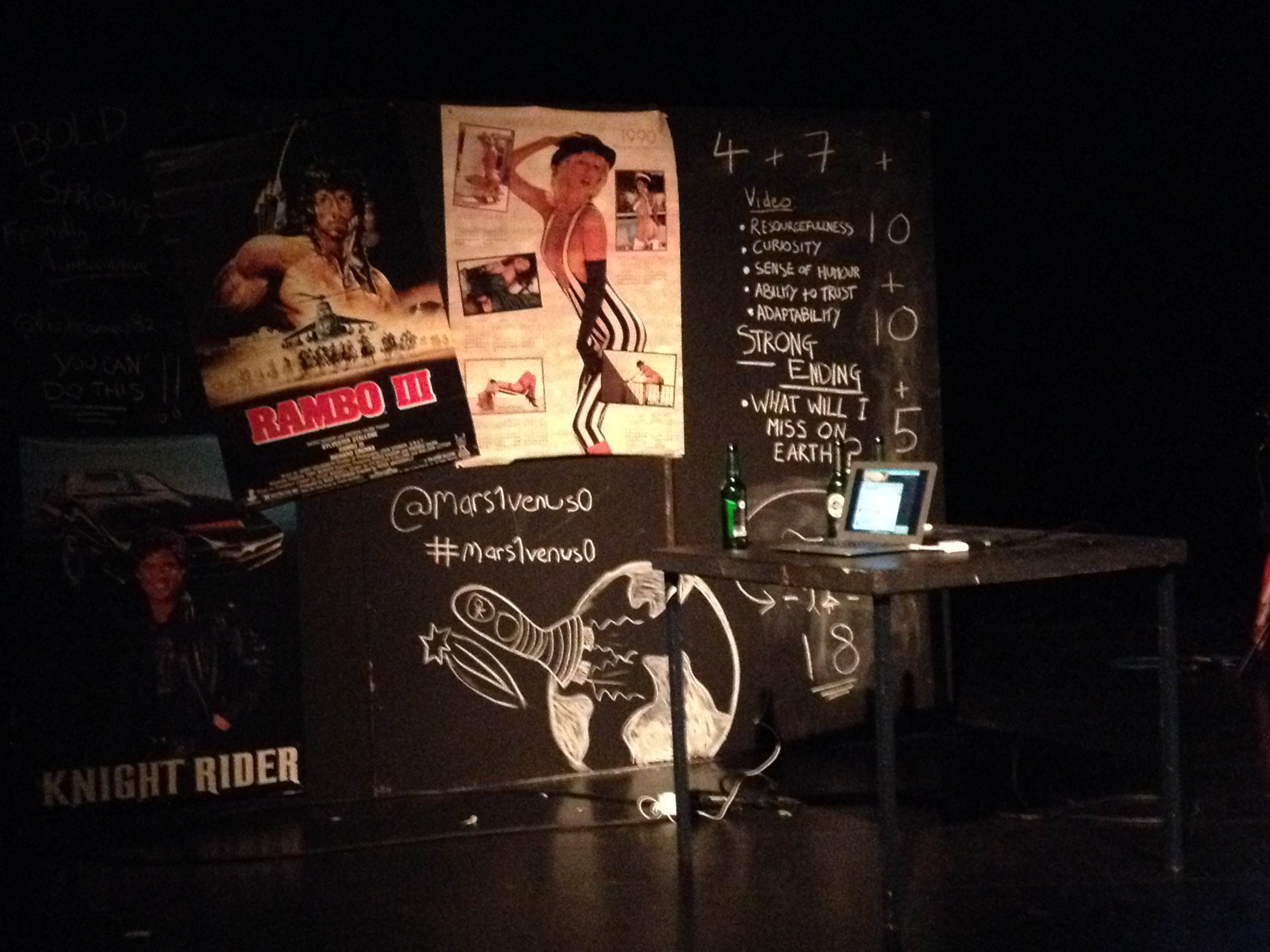 Gem Andrews and Richard Gibb penetrated into this dark virtual world to create the English lower-class character of Mike, who has ambitions to win a contest for a one-way ticket to Mars offered by an authentic website, Mars One. The five chapters of his real-time video application comprising this theater piece hover between the comic and tragic as Mike’s real life interferes, revealing sexual fears and hatred of his mother, for whom he is the caretaker. Gibb’s fearless plunge into the inertia of male ego is, gratefully, balanced by the transporting appeal of Andrews’ original songs.