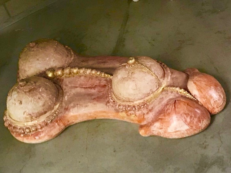 Zadikian also establishes the polarity of opposites in the erotic tension between his chosen materials. Botticelli incorporates sensuous curves by way of hydrocal mummified in red burlap for a personal signature incorporating feminine desire.