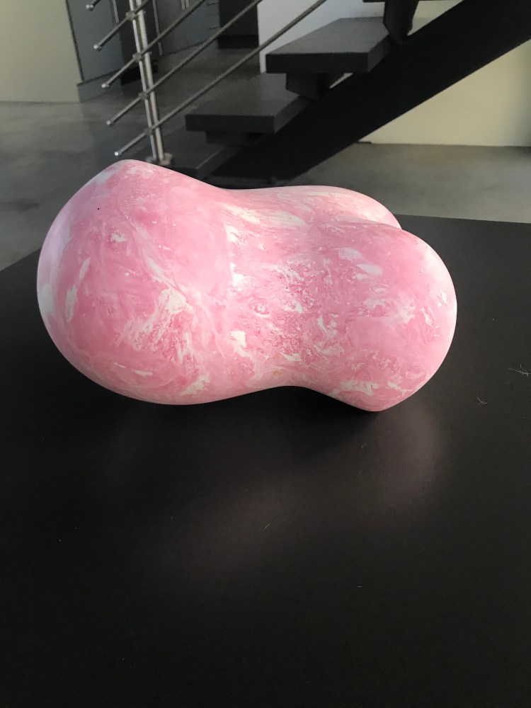 The marbleized pink coloration highlighted in Zadikian’s erotic shapes sensually merges the tension of hard/soft into a divine wedding of vertical/horizontal replacing the cross as an icon of soul surrender. The strength of his material yielding to the demands of form reflects a newfound personal power of the object as anointed subject arising from the embodiment of masculine/feminine.