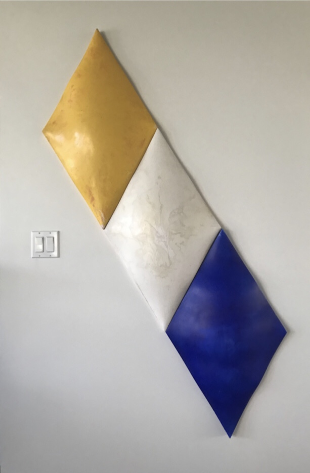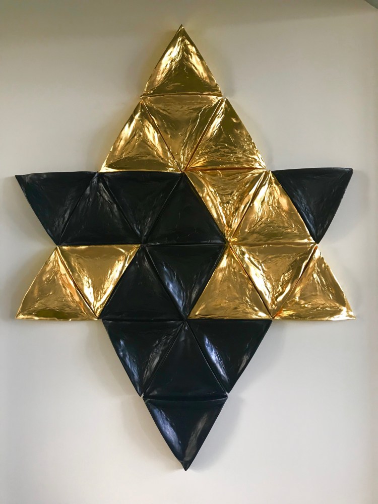 Every single triangle was sculpted individually so that they can survive by themselves as of total finish work and together they form another pattern: the 11 black triangles versus 11 gilded with 24 karat gold leaf. Extreme black absorbs all the lights and pure gold reflects all light. The balance of this to like forms enter weave so perfectly that creates mystical pattern that has entrancing powers I can think of and those qualities are very important in this work.