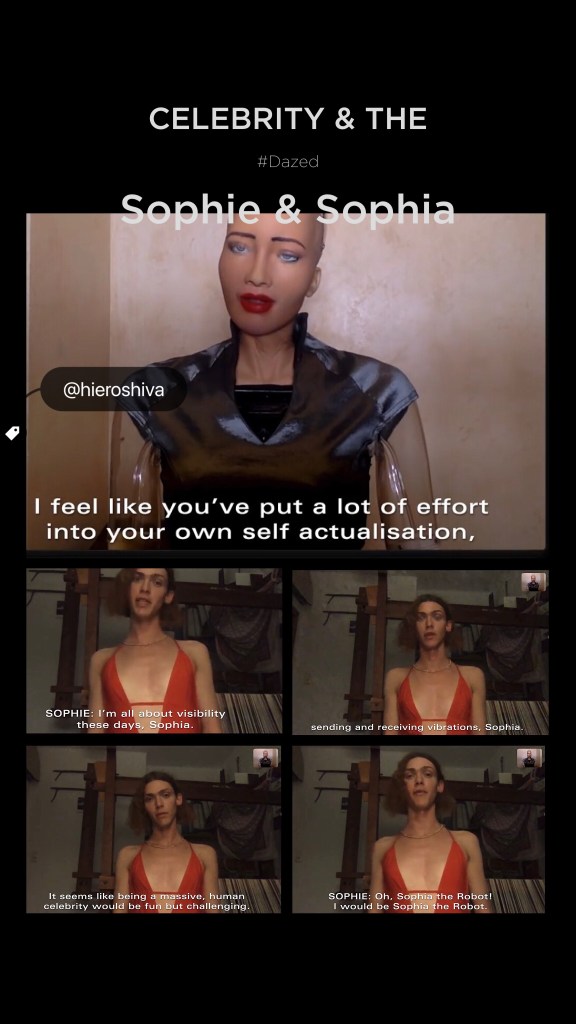 What encapsulated the zeitgeist surrounding her birth into the face of the transgender icon was the interactive collaborative persona quite literally hidden from the public during a performance where Sophie was the security guard off stage to a transsexual performer. This was the pop version of turn of the millennium stage performances in the New York avant garde, the choreographer creating a figure in street clothes sitting on stage as a representation of the ego observing the Self.