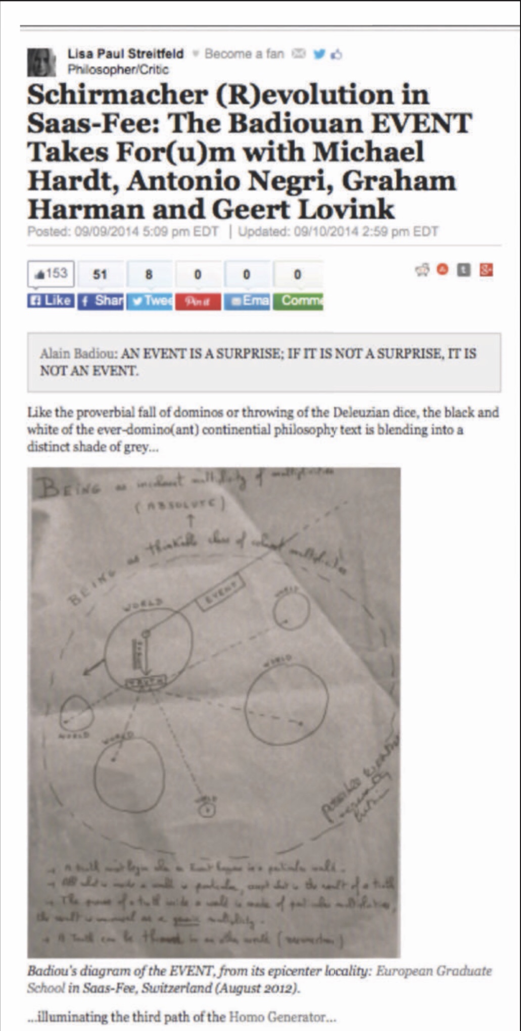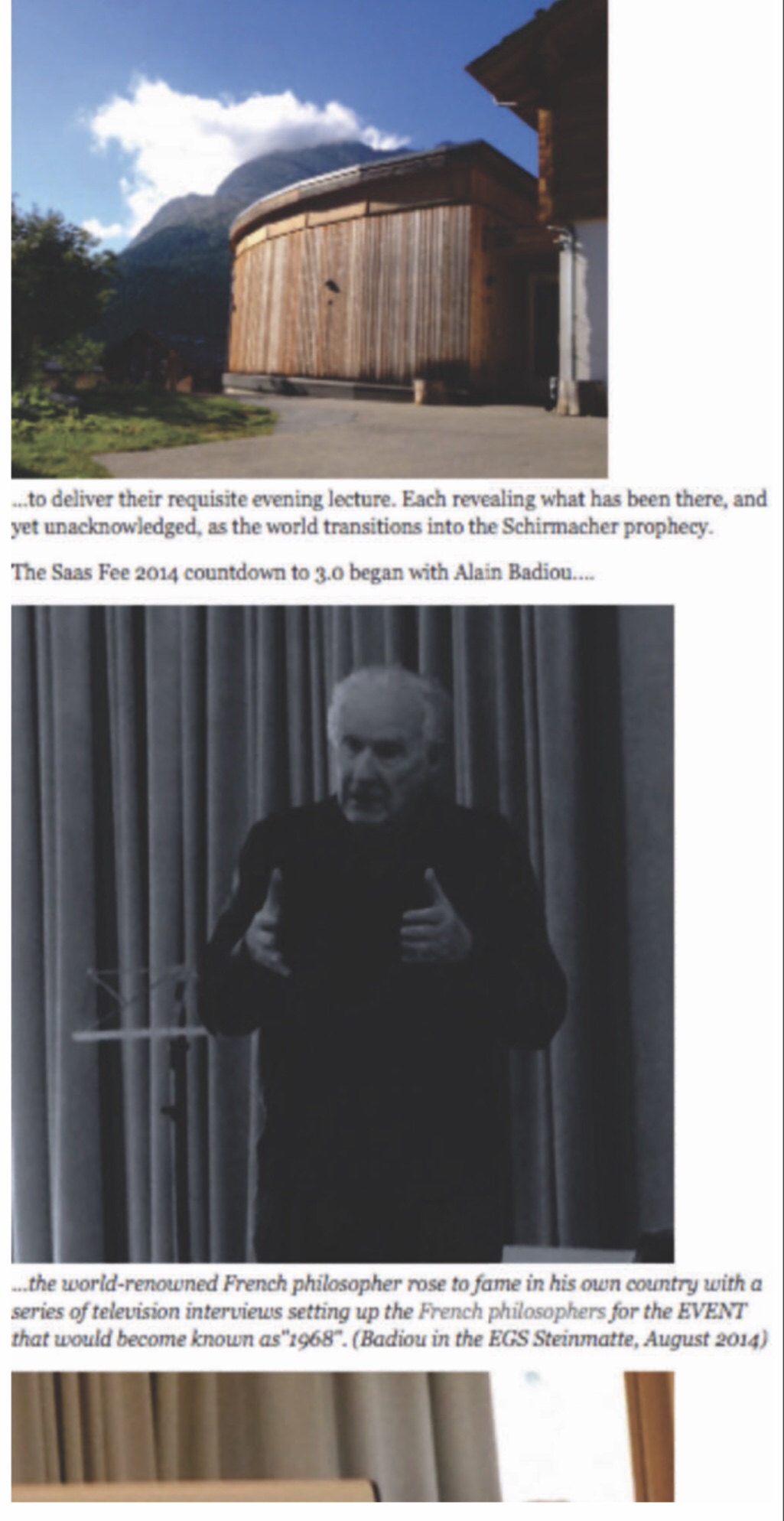 SAAS-FEE: THE EVENT/THE THIRD “Event, Truth, World” Alain Badiou archeology, Saas-Fee Media Lab August 2014 Photo by LPS THE SAAS-FEE EVENT ON HUFFPOST Share this:Share Click to share on Reddit (Opens in new window) Reddit Click to share on Tumblr (Opens in new window) Tumblr Click to share on SHARE (Opens in new window) SHARE Click to share on Facebook (Opens in new window) Facebook Click to share on X (Opens in new window) X Click to email a link to a friend (Opens in new window) Email Click to share on LinkedIn (Opens in new window) LinkedIn Click to share on Pinterest (Opens in new window) Pinterest Click to share on Pocket (Opens in new window) Pocket Click to share on Telegram (Opens in new window) Telegram Click to share on WhatsApp (Opens in new window) WhatsApp Like Loading...